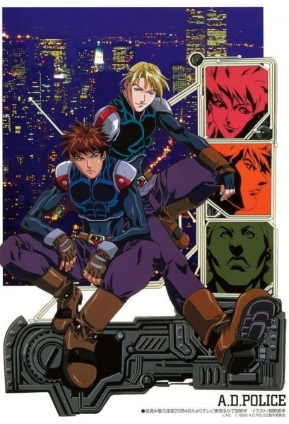 Set a few years before Bubblegum Crisis Tokyo 2040, A.D. Police chronicles the tales of Mega-Tokyo's special police division designed to control rogue Boomers in the city. A.D. Police Officer Kenji Sasaki faces a major dilemma: he loses another partner to a rabid boomer. A day after he's sent off-duty, he receives a new partner in the form of German cop Hans Kleif. Funny thing is that Kenji sucker-punched Hans at a bar the night before. Not only does Kenji face the everyday task of controlling Boomers, he has to learn to adjust with his new partner. (Source: ANN)