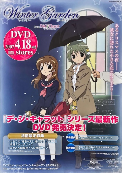 This is sweet and bitter love story of Dejiko who is a grown up. The story begins on the Christmas day. Dejiko or Di Gi Carat is working part-time at a bakery shop. On her way from the shop, she happens to meet a young guy, Senba Taokuo at a park. Then, she meets him again in a town. While Dejiko begins to care for Tako and she’s looking forward meet him again, Takuo drops in at her shop.... Whether will she succeed in love? (Source: AnimeNfo)