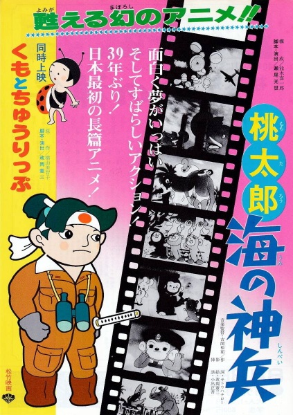 Momotarou: Umi no Shinpei is a war propaganda movie considered to be Japan's first feature-length animation work. It was produced with funding of 270,000 yen from the Ministry of the Navy. The movie was considered lost following the end of World War II, but its negatives were rediscovered in 1982. Shochiku's digital restoration of the film was screened at the 2016 Cannes Film Festival.